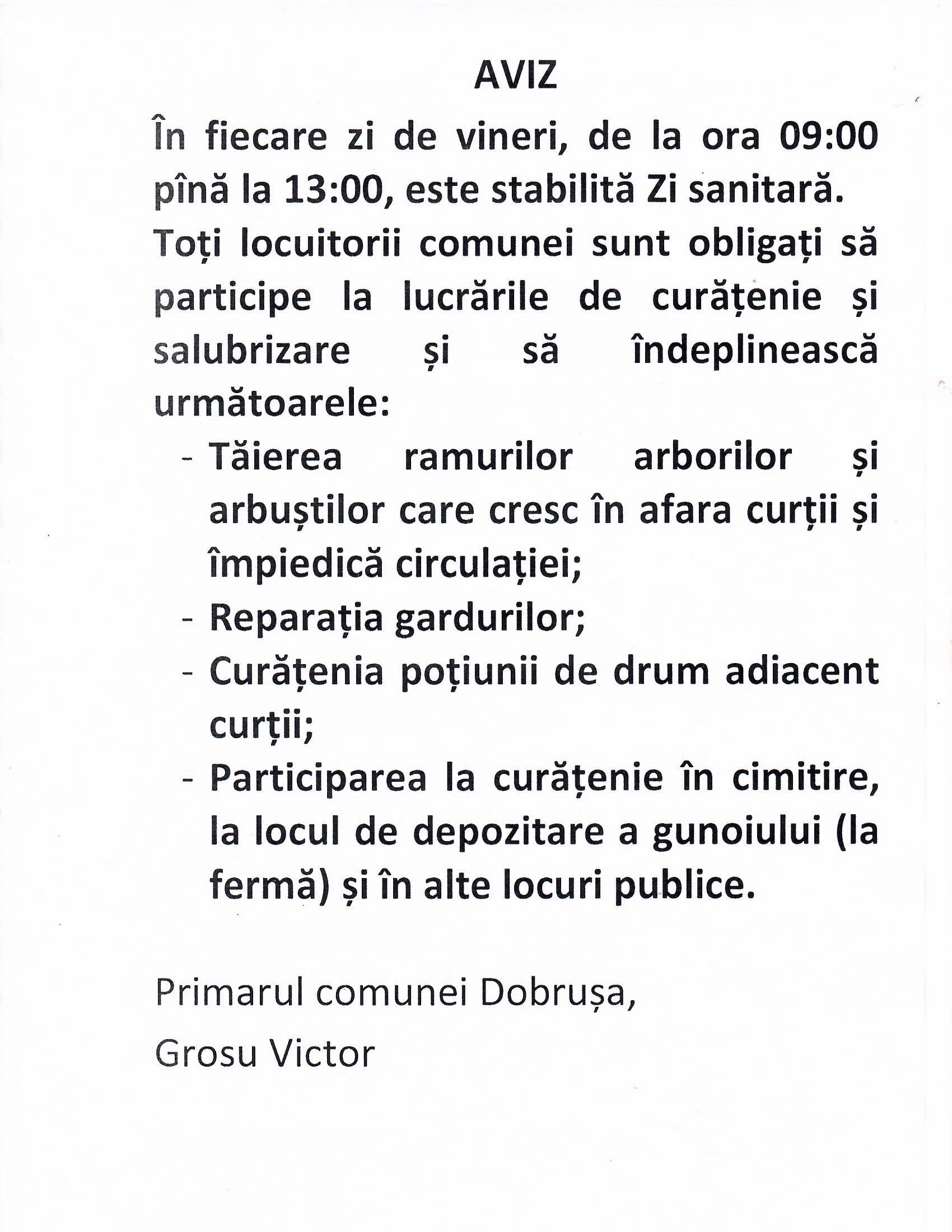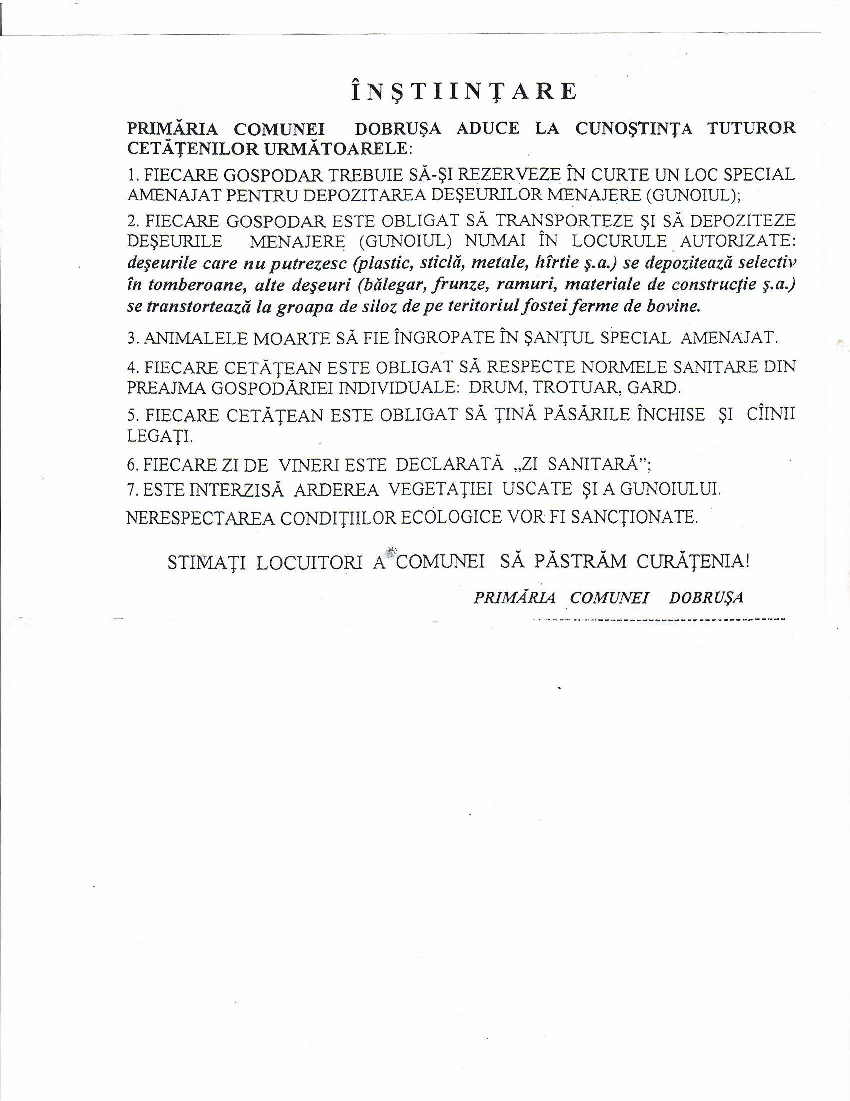 ANUNȚ Primăria comunei Dobrușa inițiază consultarea publică a proiectelor de decizie